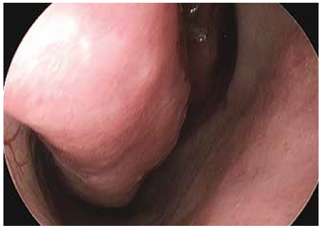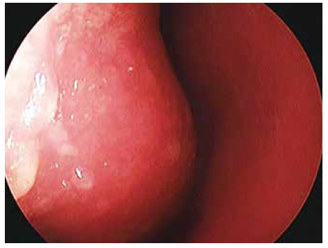 Объективно: кожные покровы бледные, влажные, теплые, температура тела 37 °C, локально слизистая носа отечна и гиперемирована, выделения из носа обильные слизистые, густые, носовое дыхание затруднено; болезненности в проекции пазух нет. Зев гиперемирован, налетов нет. Отмечается стекание умеренного количества слизистого, отделяемого по задней стенке глотки. Легкие без хрипов (рис. 1).