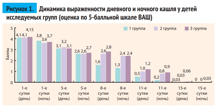 На 5-й день от начала лечения достоверных различий выраженности дневного и ночного кашля между группами не отмечалось, в то время как на 8-й день более выраженная положительная динамика уменьшения дневного и ночного кашля отмечалась в 1-й группе детей по сравнению со 2-й и 3-й группами.
