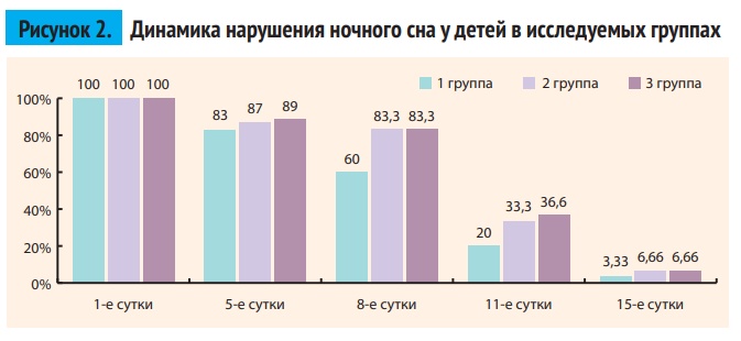 На 15-й день лечения нарушение сна было устранено практически у всех детей, поэтому оценка не показала достоверно значимых различий между группами (рис. 2).