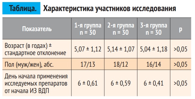 Во второй части исследования все пациенты были разделены на три группы. У 30 детей 1-й группы (основной) в дополнение к стандартной терапии применяли согревающий гель Дыши для детей. Гель наносился на сухую чистую кожу грудной клетки ребенка 3 раза в день. После нанесения геля надевалась теплая одежда. 30 пациентов 2-й группы (группы сравнения) в дополнение к стандартной терапии получали Доктор Мом фито мазь (производитель Unique Pharmaceutical Laboratories, Индия). В состав данной мази входят ментол, камфора, тимол, скипидарное масло, эвкалиптовое масло, мускатное масло и парафин. Мазь втирали в кожу грудины ребенка 3 раза в сутки, затем надевали теплую одежду. 30 детей 3-й (контрольной) группы получали только стандартную терапию без использования других гелей и мазей на основе эфирных масел. Характеристика участников исследования приведена в таблице.